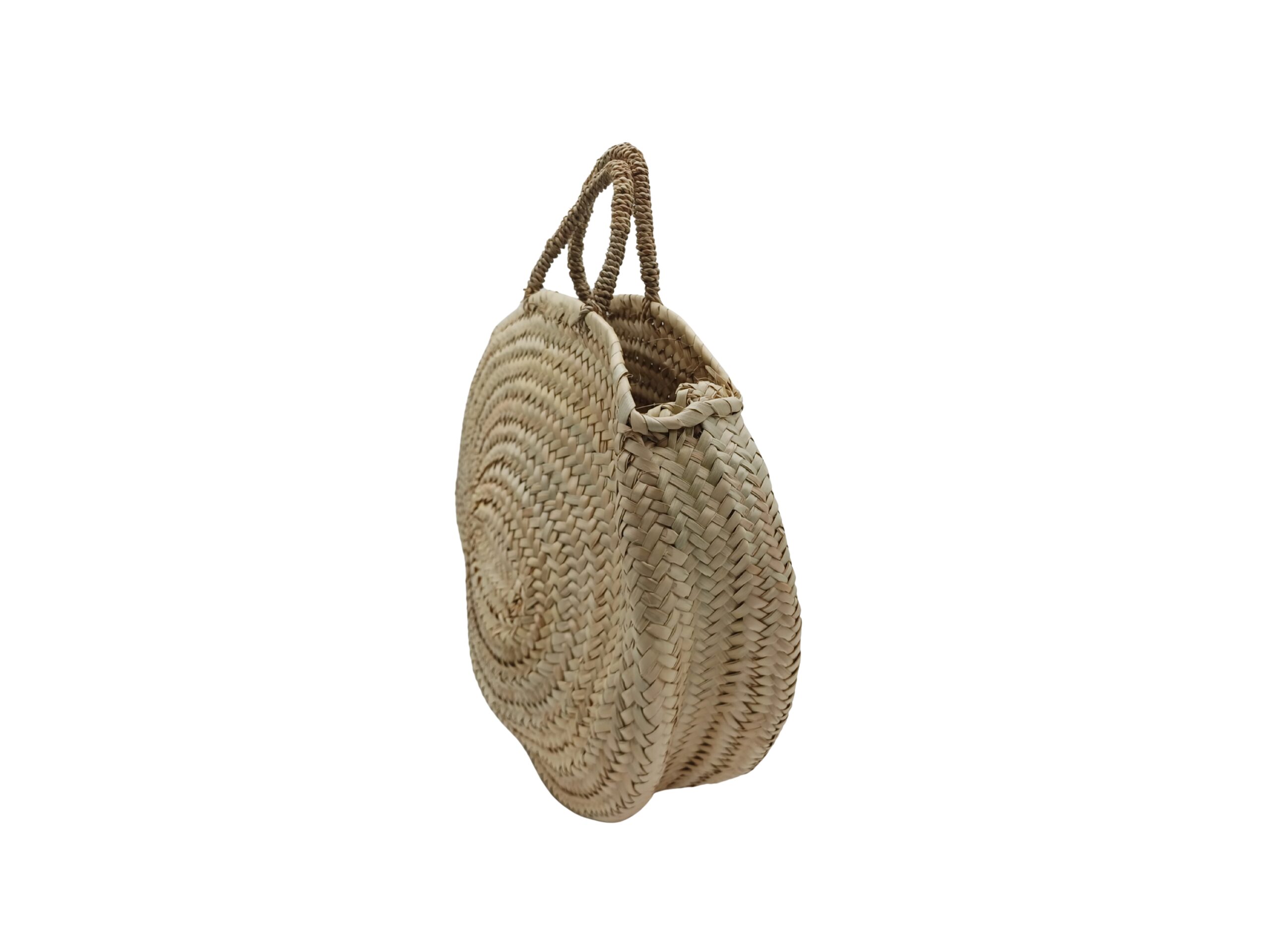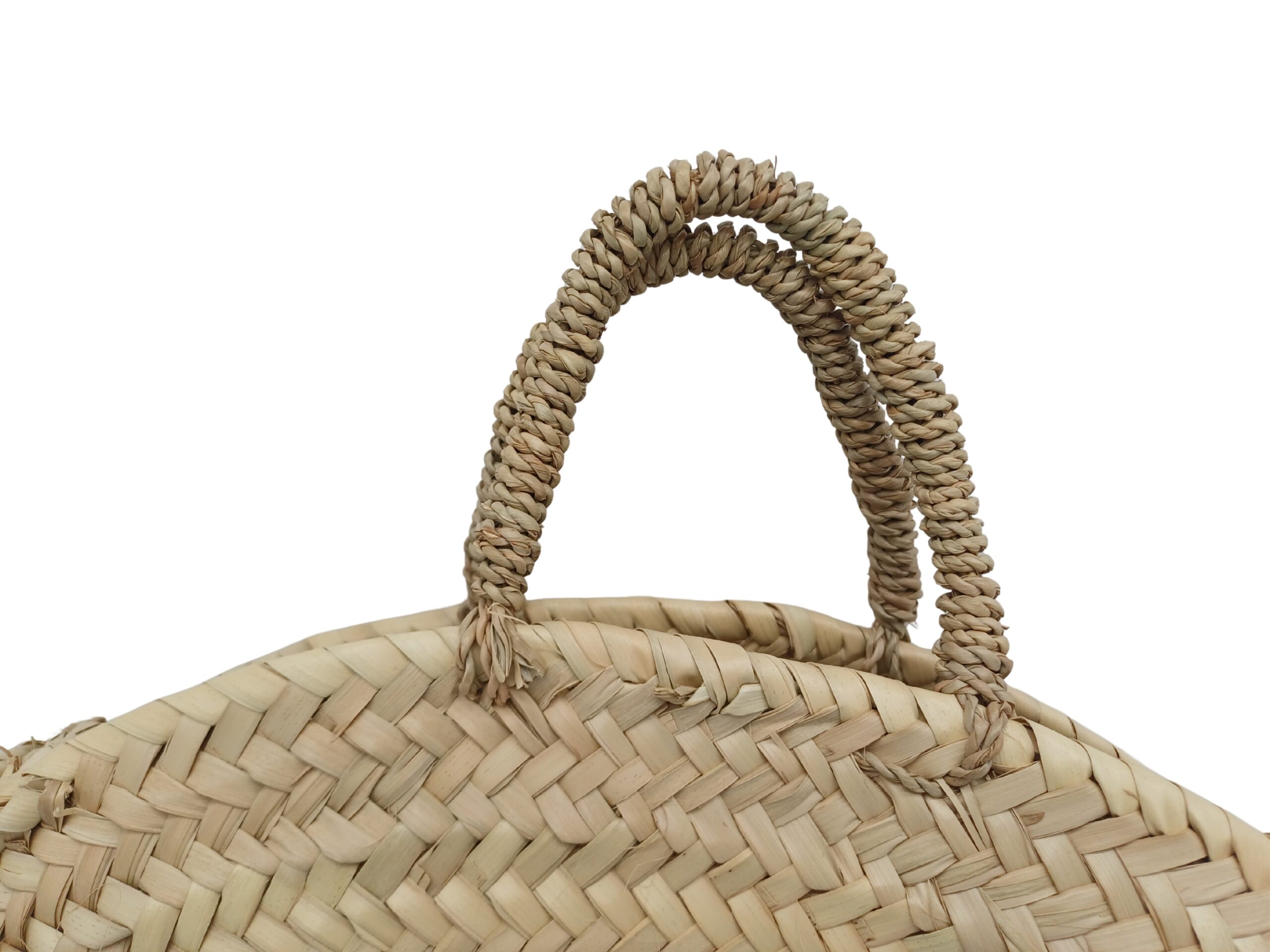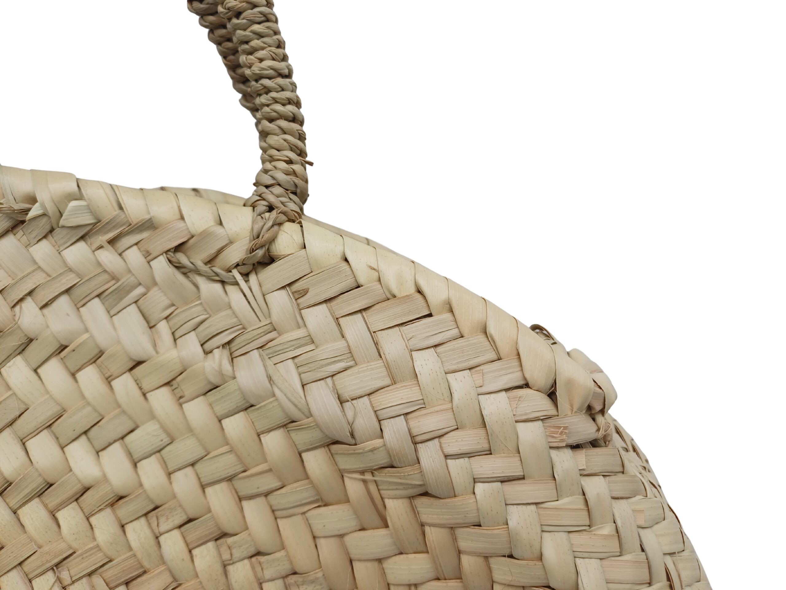 Bolso redondo artesanal de hoja de palma. Con un diseño bohemio que combina la belleza tradicional y la funcionalidad moderna, este accesorio es perfecto para complementar tu estilo casual o veraniego. Sus dimensiones de 45x45cm ofrecen espacio suficiente para tus elementos esenciales, mientras que sus asas pequeñas permiten un transporte cómodo y manual. Fabricado en España con hojas de palma tejidas meticulosamente, presenta un hermoso tono beige que combina fácilmente con cualquier conjunto. Este bolso de mano es ideal para mujeres que buscan un accesorio versátil con un toque artesanal único. Su diseño ligero y espacioso lo convierte en el complemento perfecto para paseos por la ciudad o días de playa. La construcción con materiales naturales aporta una textura única y un aspecto distintivo a cada bolso.