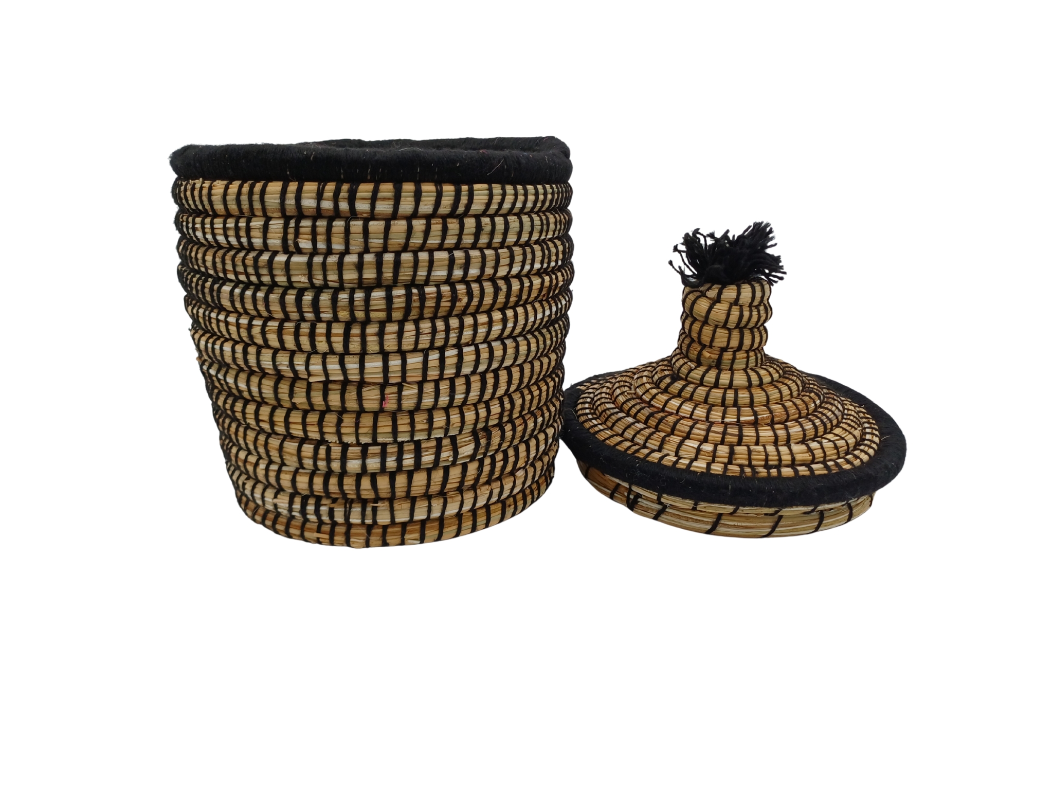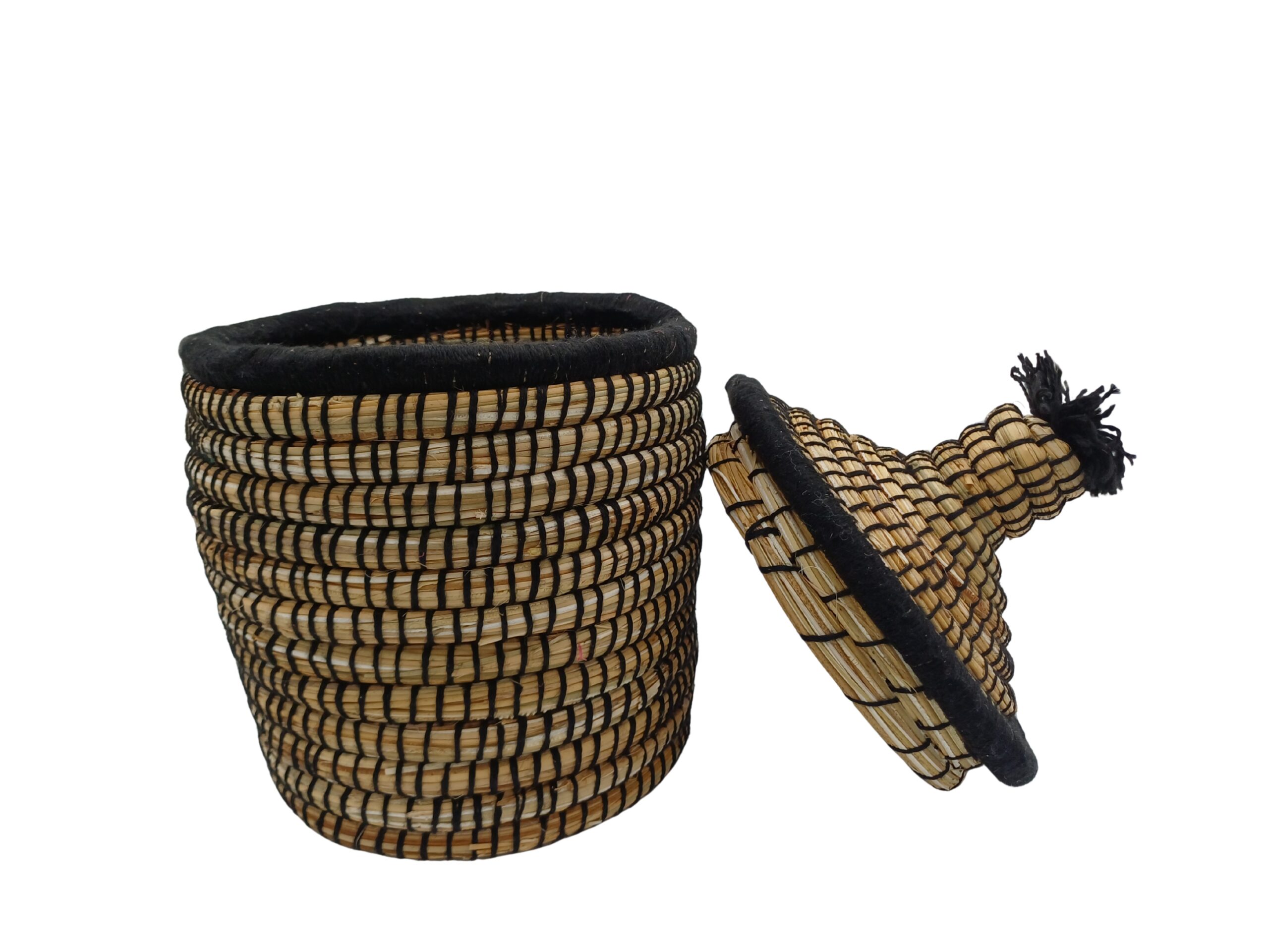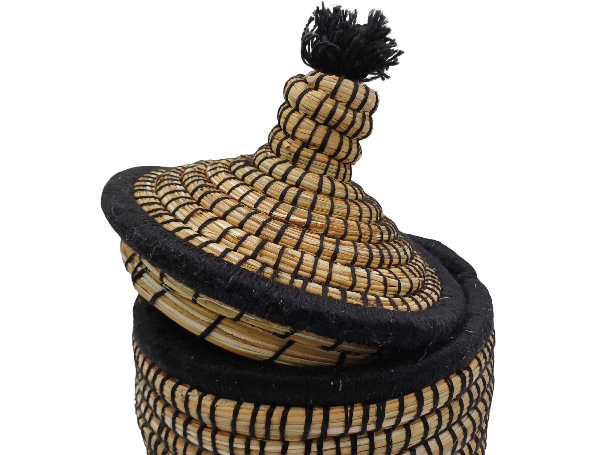 Cesta de almacenamiento de ZocoChic. Confeccionada a mano con fibras naturales y detalles en lana, esta pieza única combina belleza y funcionalidad en un diseño cilíndrico de estilo marroquí. Con dimensiones de 30 cm de altura y 20 cm de diámetro, es perfecta para organizar diversos objetos en cualquier espacio del hogar. Su tapa tejida no solo añade un toque decorativo con su pompón característico, sino que también protege el contenido del polvo. Los tonos beige y negro crean un patrón entrelazado que aporta un elemento decorativo sofisticado a cualquier habitación. Con un peso ligero de 0,5 kg, esta cesta es tan práctica como hermosa. El acabado natural de las fibras y el tejido tradicional reflejan la rica herencia artesanal de Marruecos, convirtiendo cada pieza en un accesorio único para tu hogar. Ideal para almacenar desde textiles hasta objetos personales, esta cesta combina perfectamente la tradición artesanal con la funcionalidad moderna.